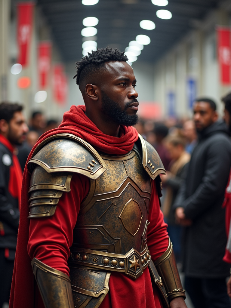 model in cosplay group photo, wearing a heroic paladin costume with glowing armor, interacting with other cosplayers, vibrant and fun atmosphere