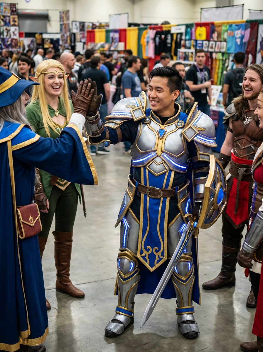 model in cosplay group photo, wearing a heroic paladin costume with glowing armor, interacting with other cosplayers, vibrant and fun atmosphere