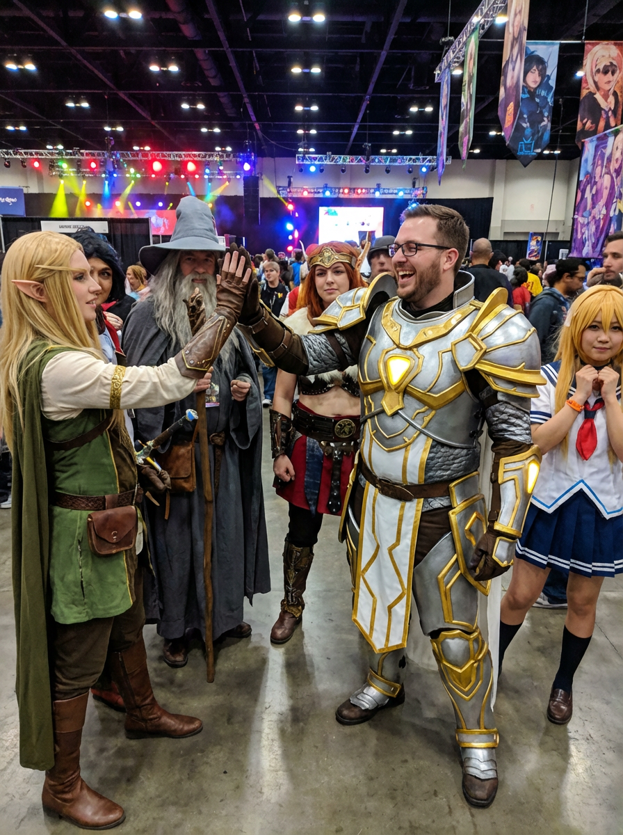 model in cosplay group photo, wearing a heroic paladin costume with glowing armor, interacting with other cosplayers, vibrant and fun atmosphere