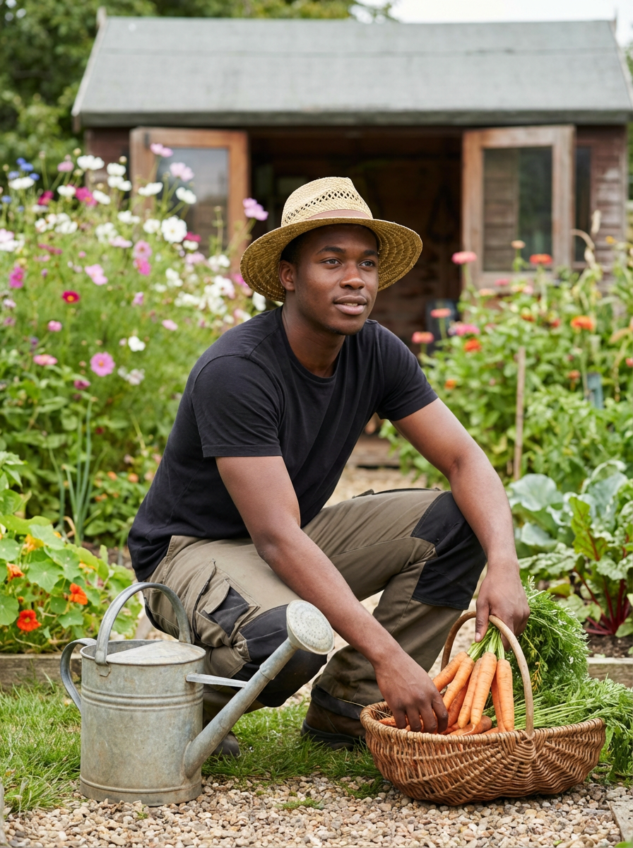 model in cottage garden, straw hat, gathering vegetables, vintage watering can, quaint garden shed background