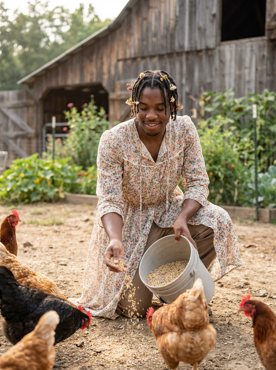 model in cottagecore fashion, prairie dress, braided hair with flowers, feeding chickens, farm setting