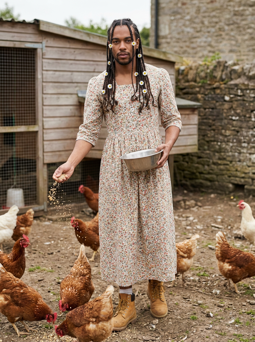 model in cottagecore fashion, prairie dress, braided hair with flowers, feeding chickens, farm setting