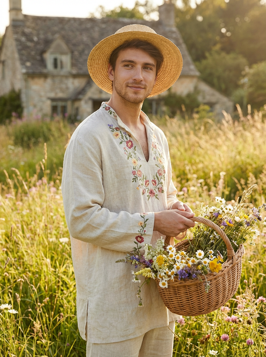 model in cottagecore outfit, flowy floral dress, wicker basket of wildflowers, sunny meadow setting, soft romantic lighting