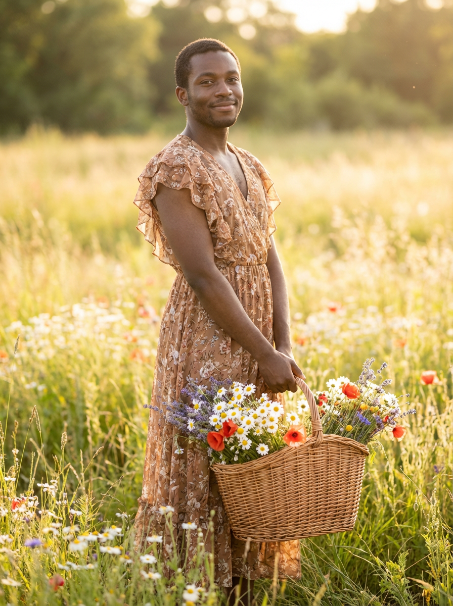 model in cottagecore outfit, flowy floral dress, wicker basket of wildflowers, sunny meadow setting, soft romantic lighting