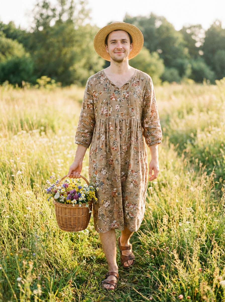 model in cottagecore outfit, flowy floral dress, wicker basket of wildflowers, sunny meadow setting, soft romantic lighting