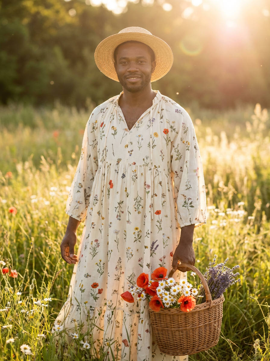 model in cottagecore outfit, flowy floral dress, wicker basket of wildflowers, sunny meadow setting, soft romantic lighting