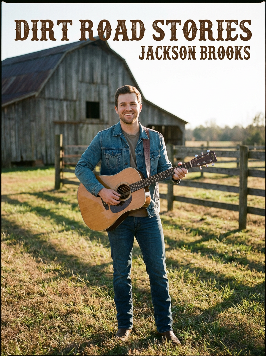 model in country album cover setting, authentic rural backdrop, genuine expression, storytelling mood