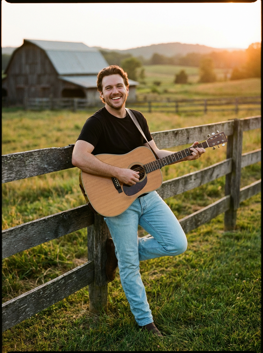 model in country album cover setting, authentic rural backdrop, genuine expression, storytelling mood