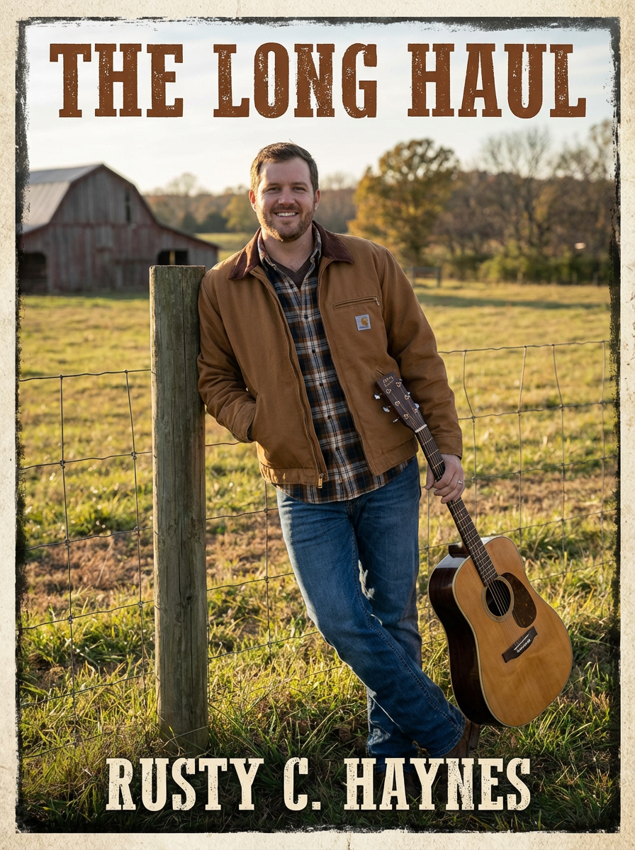model in country album cover setting, authentic rural backdrop, genuine expression, storytelling mood