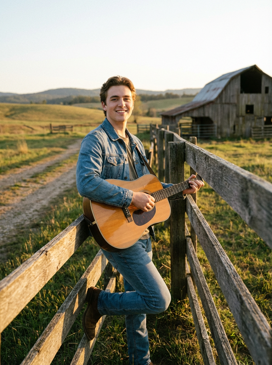 model in country album cover setting, authentic rural backdrop, genuine expression, storytelling mood