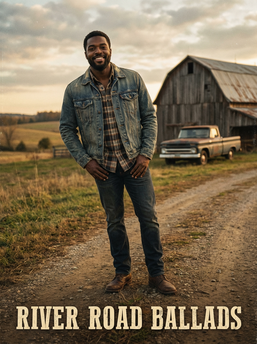 model in country album cover setting, authentic rural backdrop, genuine expression, storytelling mood