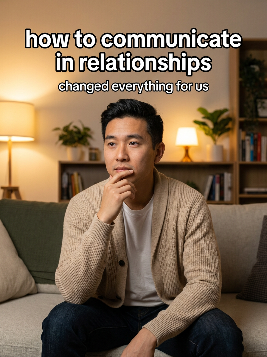 model in couples therapy attire in comfortable living room setting, thoughtful expression, warm intimate lighting. TikTok TikTok-style text overlay with white text with black outline: "how to communicate in relationships" smaller text: "(changed everything for us)", do not show tiktok interface or logo