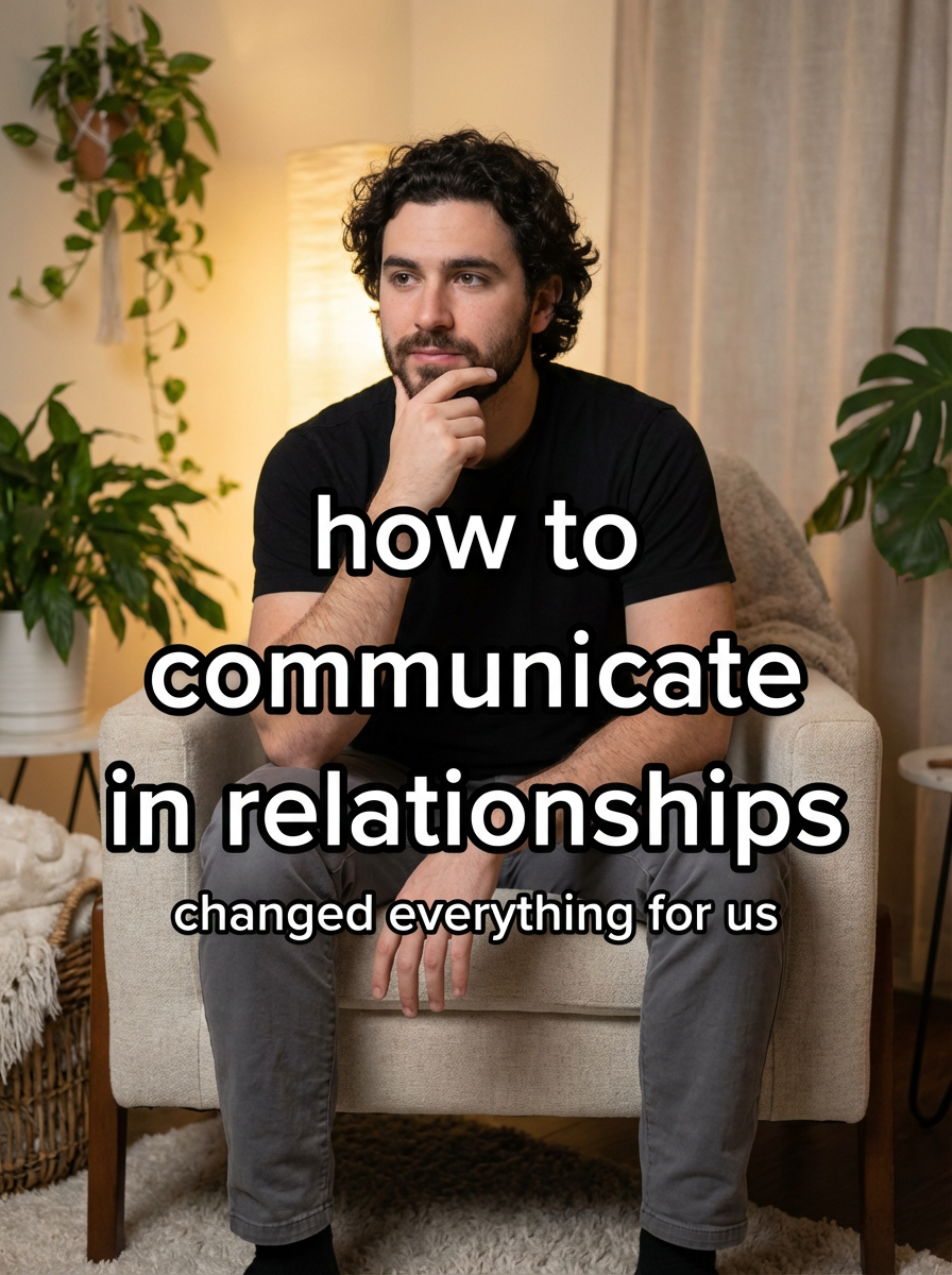 model in couples therapy attire in comfortable living room setting, thoughtful expression, warm intimate lighting. TikTok TikTok-style text overlay with white text with black outline: "how to communicate in relationships" smaller text: "(changed everything for us)", do not show tiktok interface or logo