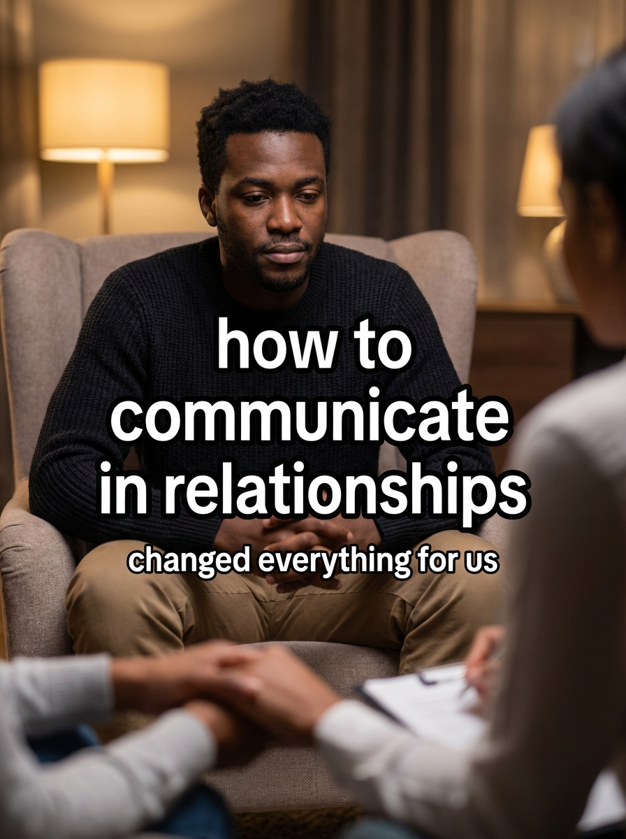 model in couples therapy attire in comfortable living room setting, thoughtful expression, warm intimate lighting. TikTok TikTok-style text overlay with white text with black outline: "how to communicate in relationships" smaller text: "(changed everything for us)", do not show tiktok interface or logo