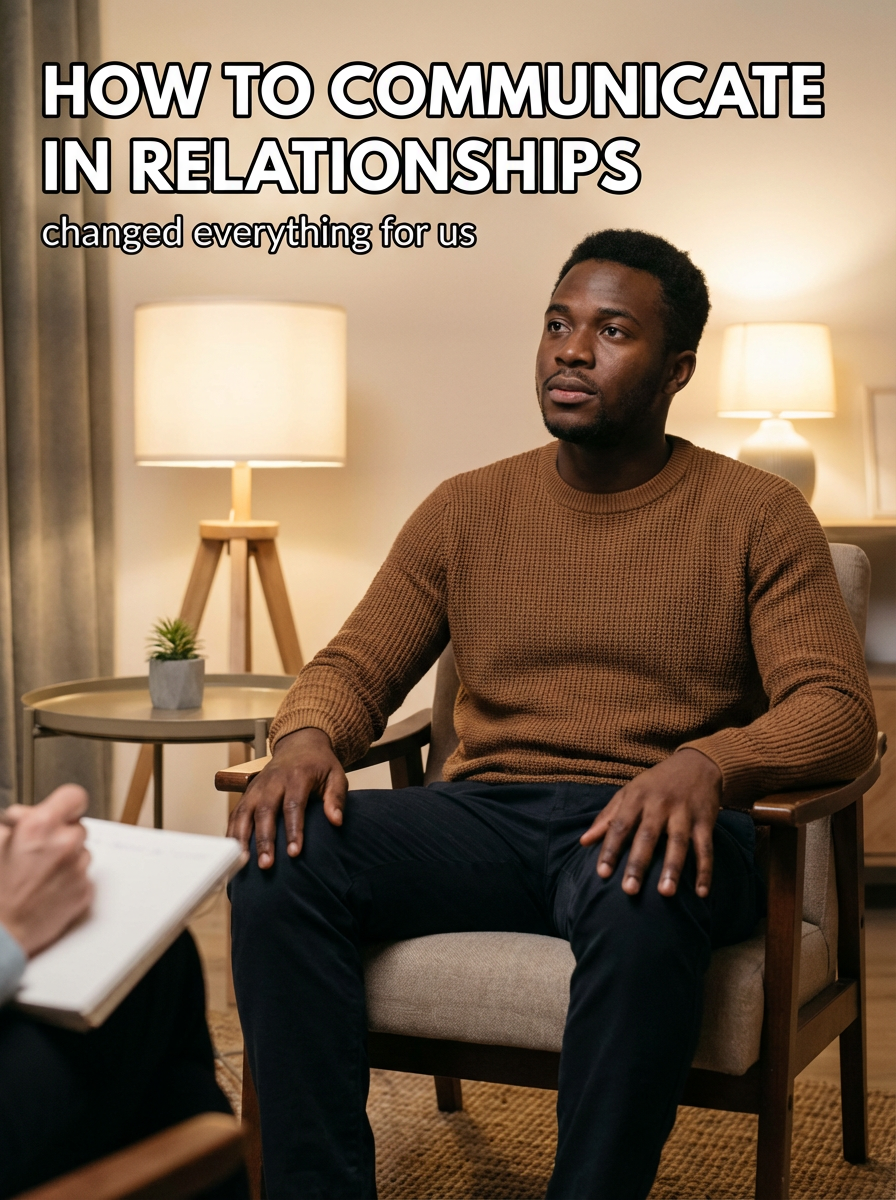 model in couples therapy attire in comfortable living room setting, thoughtful expression, warm intimate lighting. TikTok-style text overlay with white text with black outline: "how to communicate in relationships" smaller text: "(changed everything for us)", do not show tiktok interface or logo