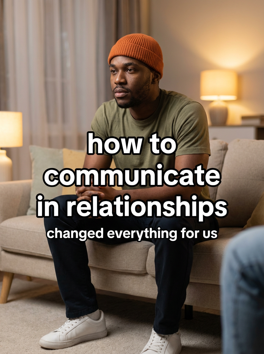 model in couples therapy attire in comfortable living room setting, thoughtful expression, warm intimate lighting. TikTok-style text overlay with white text with black outline: "how to communicate in relationships" smaller text: "(changed everything for us)", do not show tiktok interface or logo