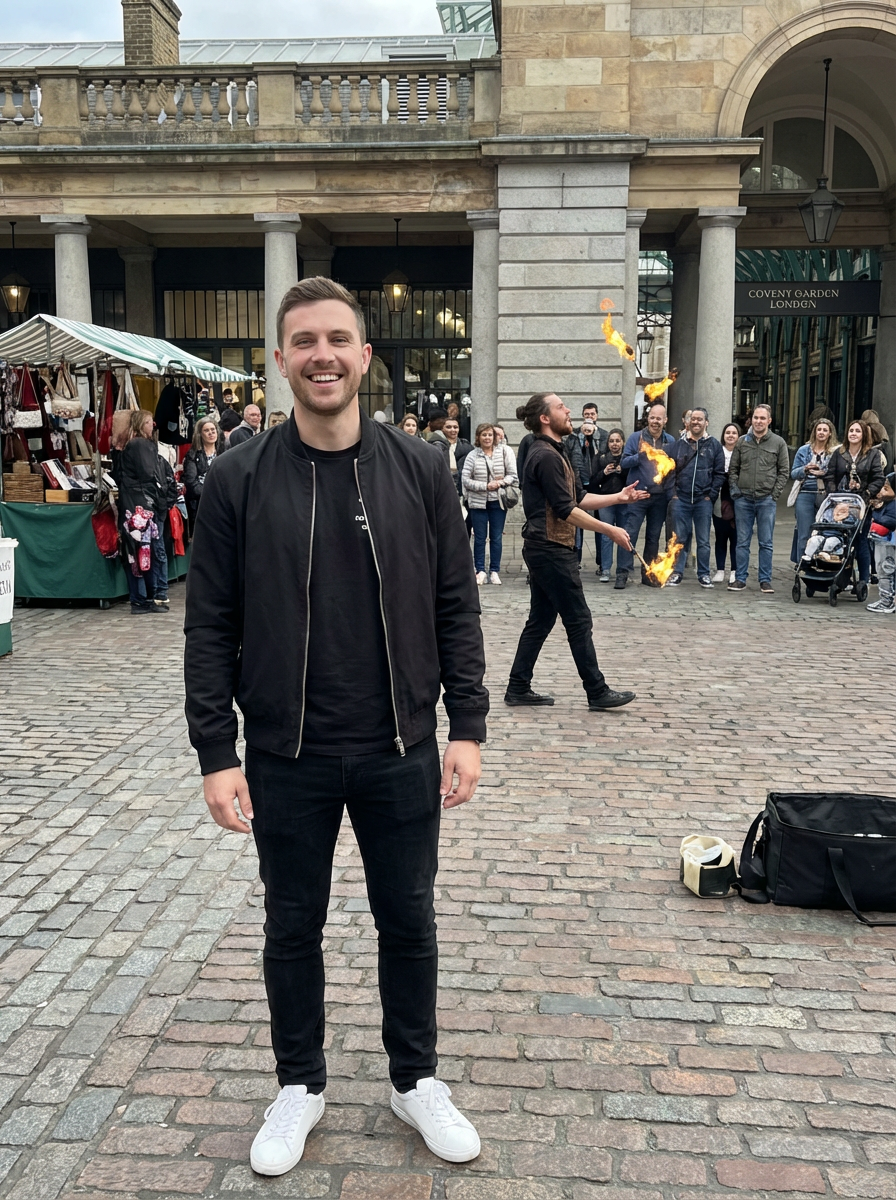 model in Covent Garden, street performer background, stylish shopping outfit, lively atmosphere