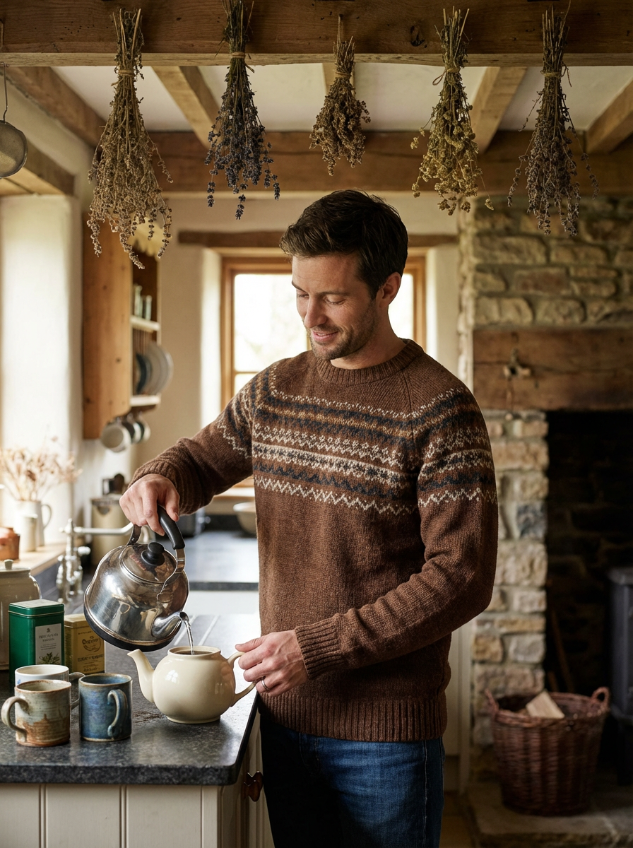 model in cozy cottage interior, rustic sweater, making tea, dried herbs hanging