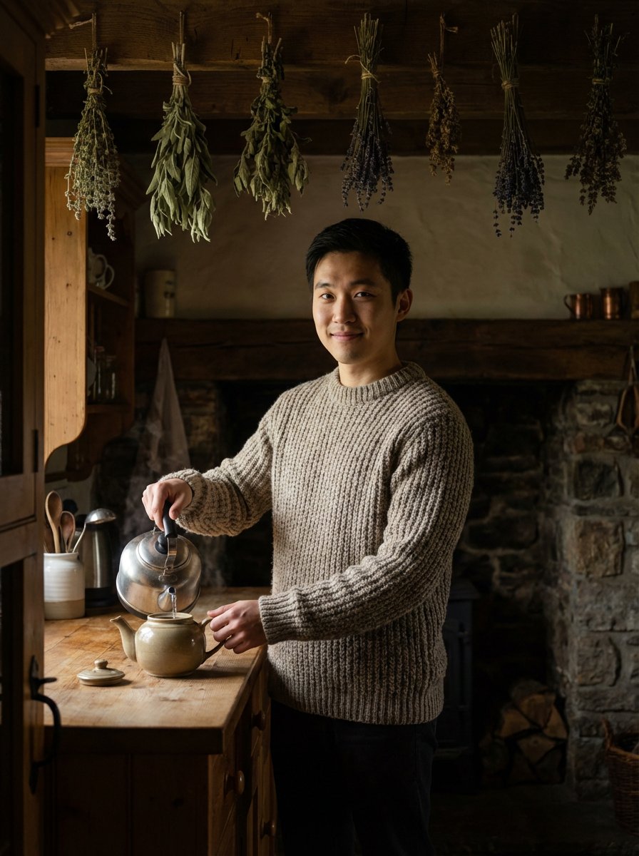model in cozy cottage interior, rustic sweater, making tea, dried herbs hanging