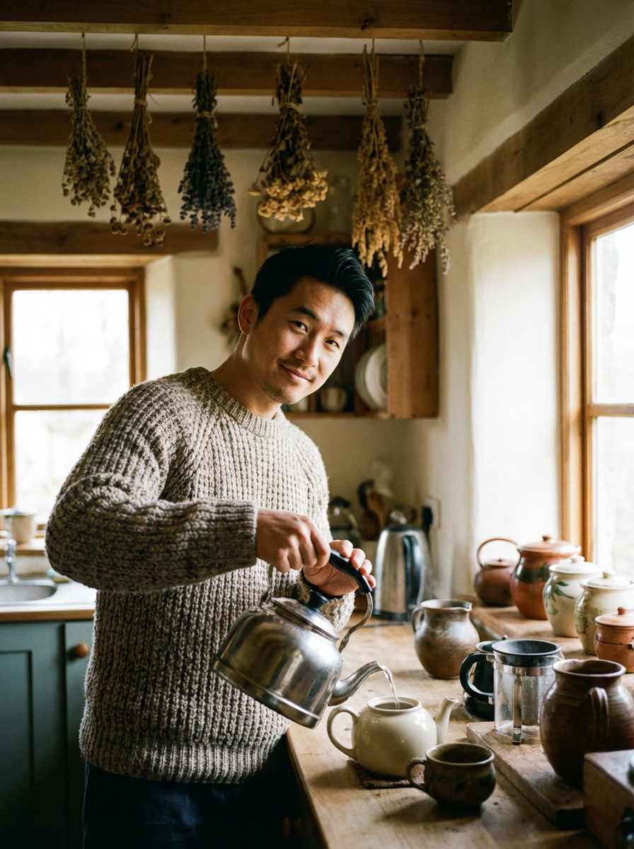 model in cozy cottage interior, rustic sweater, making tea, dried herbs hanging