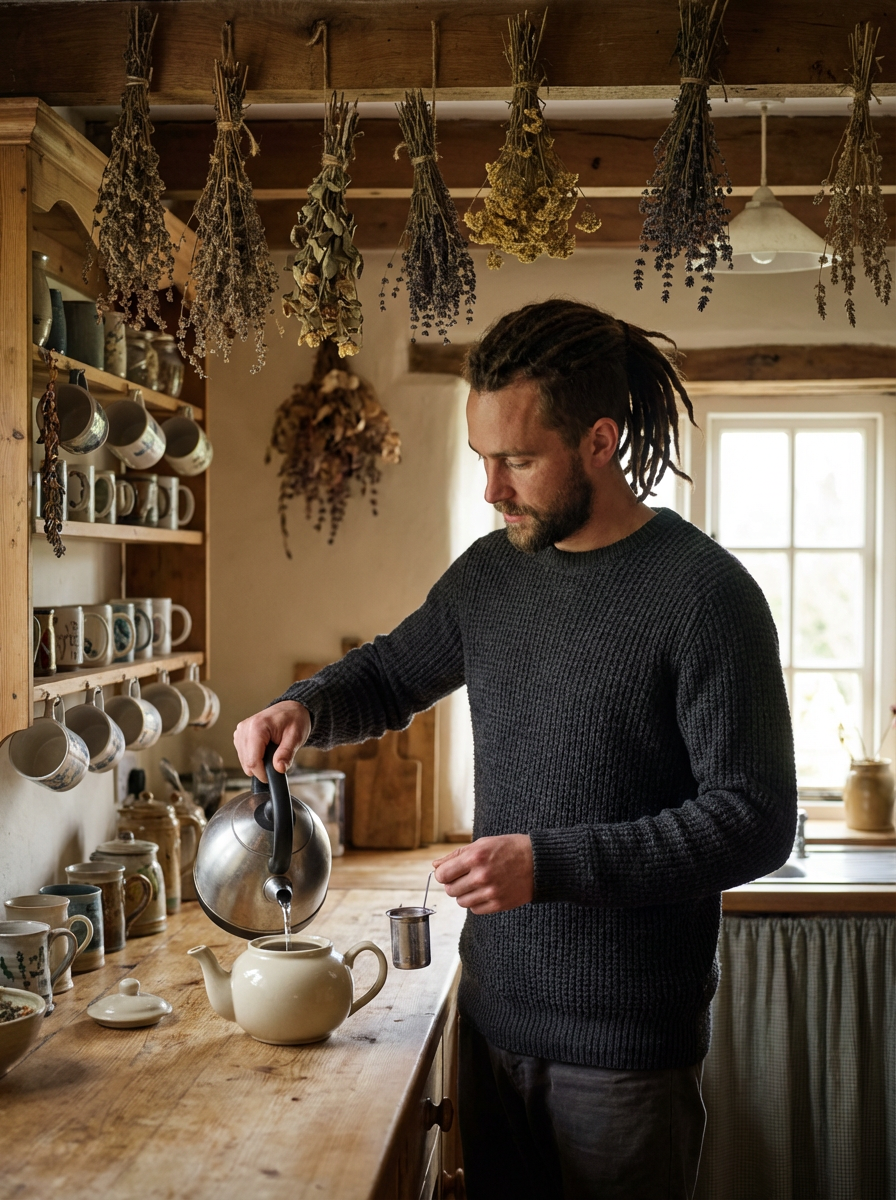 model in cozy cottage interior, rustic sweater, making tea, dried herbs hanging
