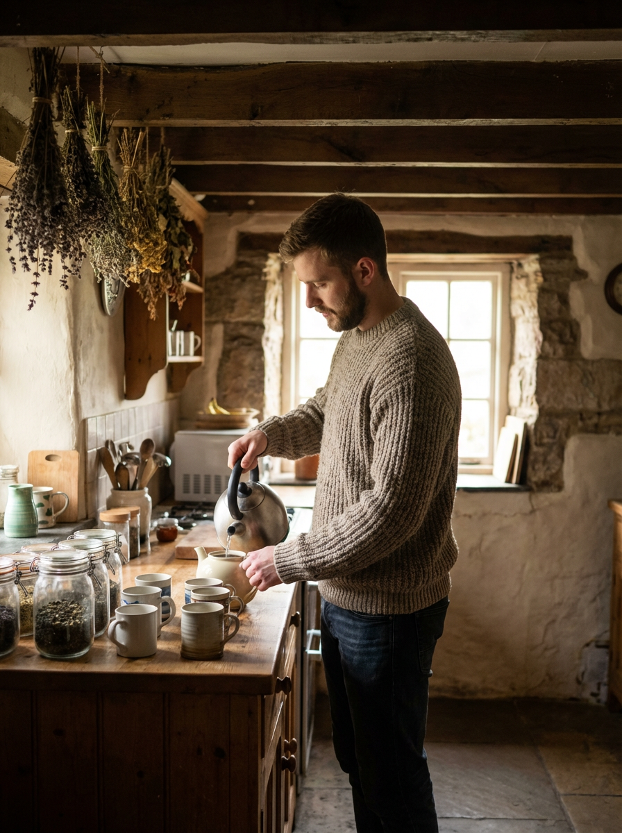 model in cozy cottage interior, rustic sweater, making tea, dried herbs hanging