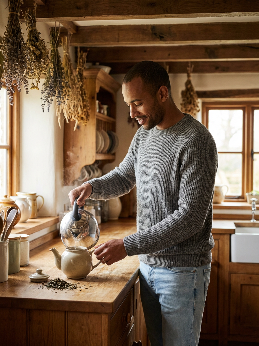 model in cozy cottage interior, rustic sweater, making tea, dried herbs hanging