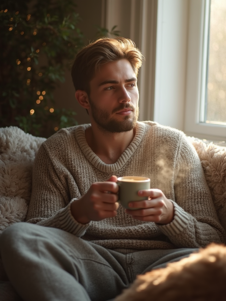 model in cozy morning routine, wearing warm knit sweater and comfortable loungewear, holding steaming coffee mug, soft natural lighting streaming through window, peaceful expression, hygge aesthetic
