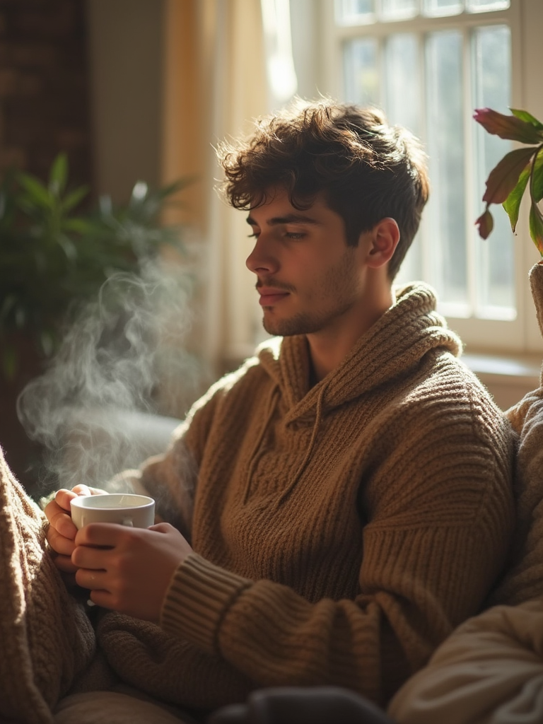 model in cozy morning routine, wearing warm knit sweater and comfortable loungewear, holding steaming coffee mug, soft natural lighting streaming through window, peaceful expression, hygge aesthetic
