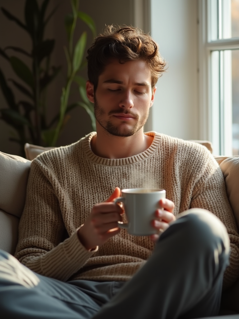 model in cozy morning routine, wearing warm knit sweater and comfortable loungewear, holding steaming coffee mug, soft natural lighting streaming through window, peaceful expression, hygge aesthetic