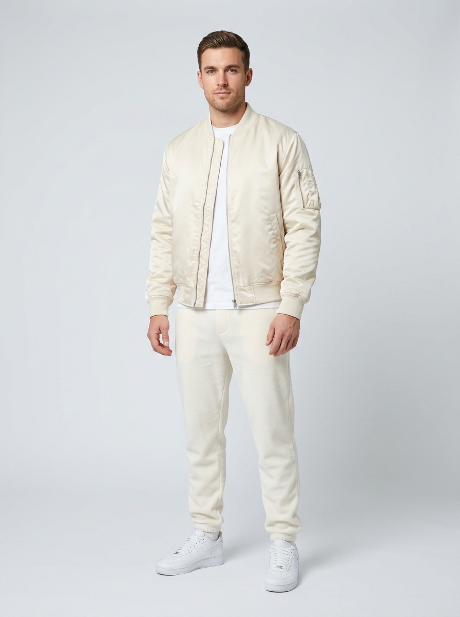 model in cream bomber jacket with off-white joggers and white sneakers, modern elevated off-white styling, clean backdrop, bright even lighting