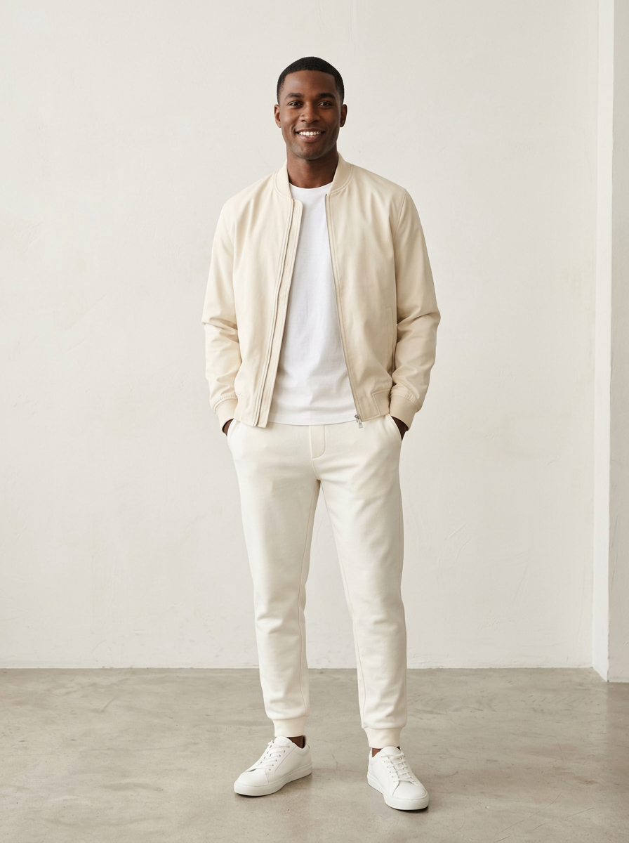 model in cream bomber jacket with off-white joggers and white sneakers, modern elevated off-white styling, clean backdrop, bright even lighting