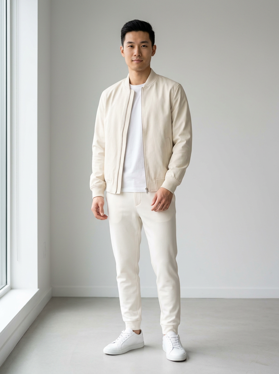 model in cream bomber jacket with off-white joggers and white sneakers, modern elevated off-white styling, clean backdrop, bright even lighting
