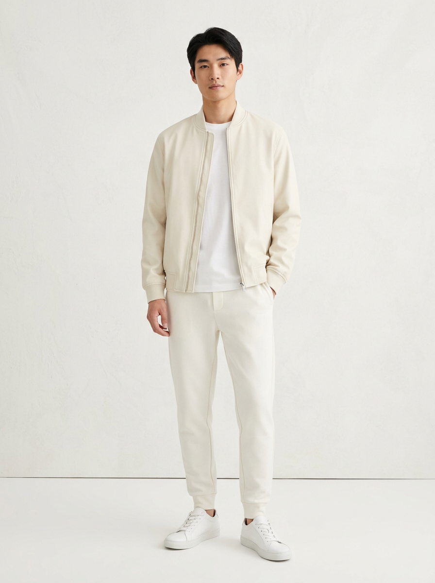 model in cream bomber jacket with off-white joggers and white sneakers, modern elevated off-white styling, clean backdrop, bright even lighting