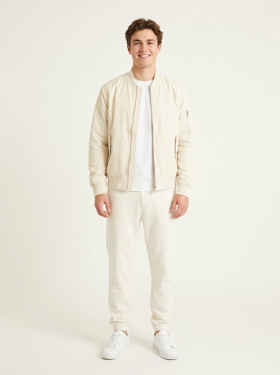 model in cream bomber jacket with off-white joggers and white sneakers, modern elevated off-white styling, clean backdrop, bright even lighting