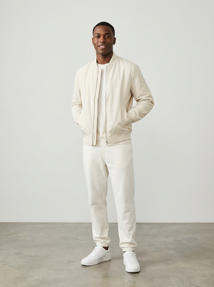 model in cream bomber jacket with off-white joggers and white sneakers, modern elevated off-white styling, clean backdrop, bright even lighting