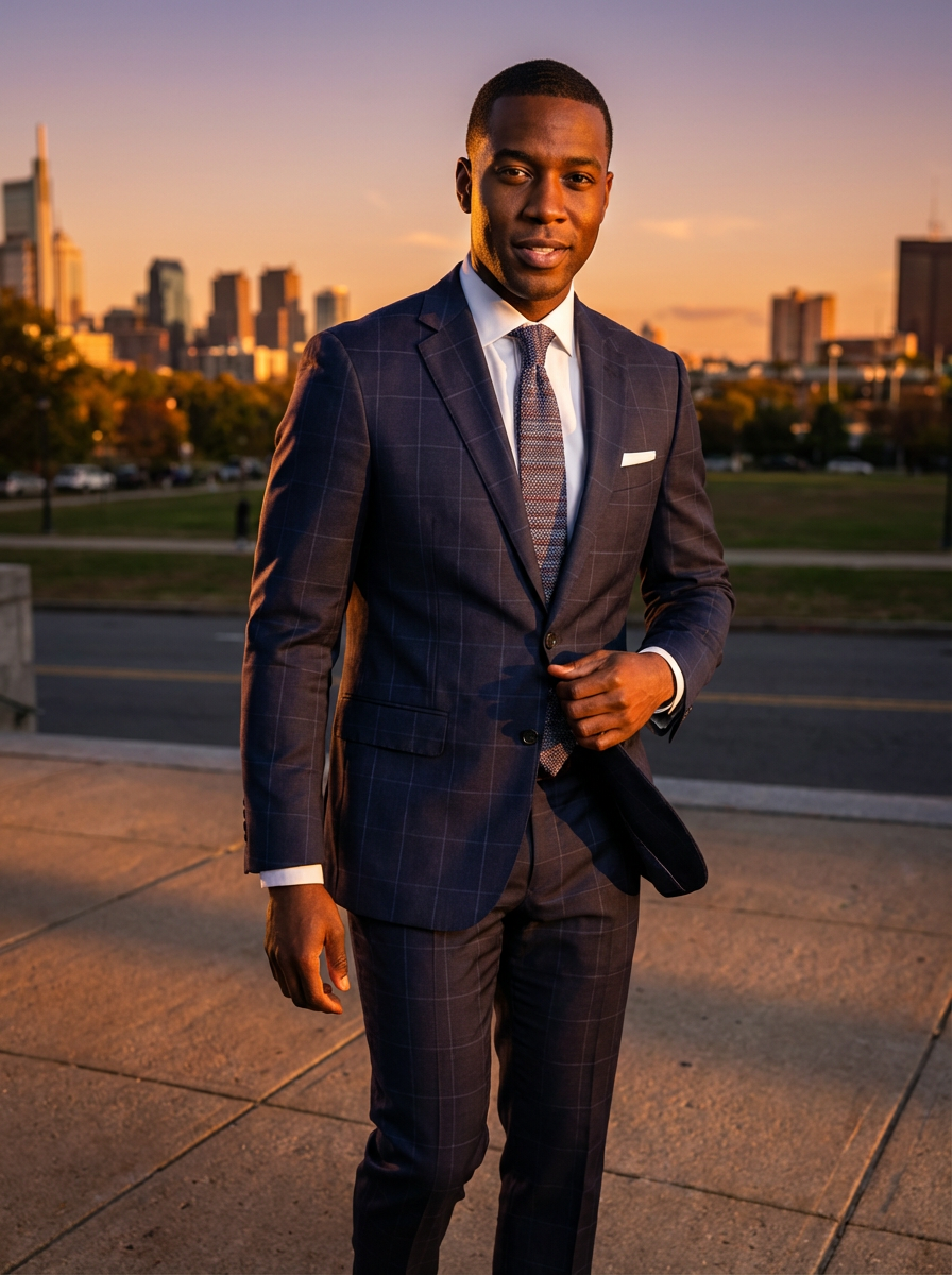 model in dapper suit, radiating allure under the soft glow of a sunset