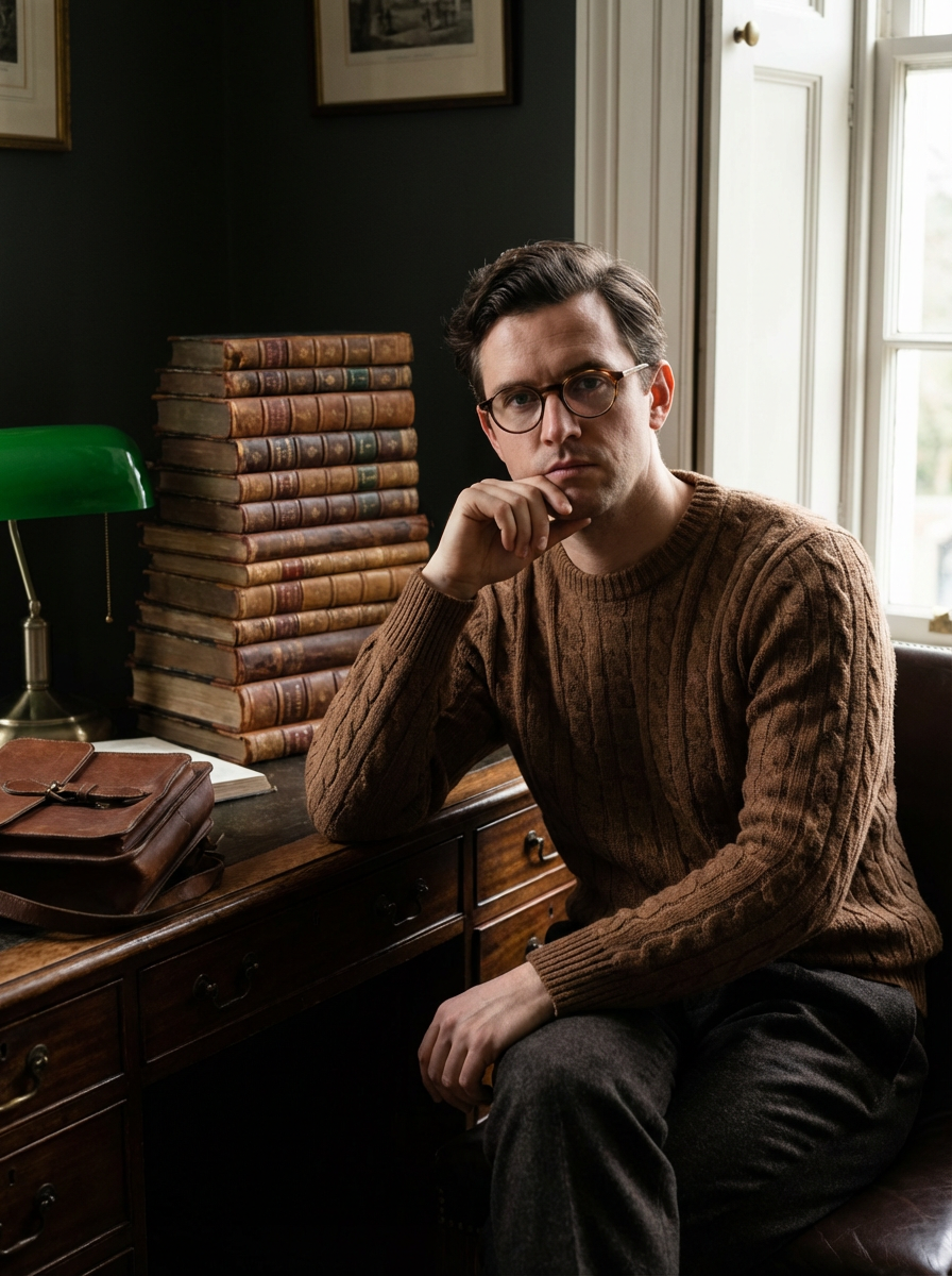 model in dark academia aesthetic, round glasses, cable knit sweater, stack of antique books, study desk scene