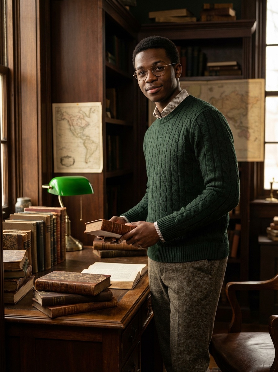 model in dark academia aesthetic, round glasses, cable knit sweater, stack of antique books, study desk scene