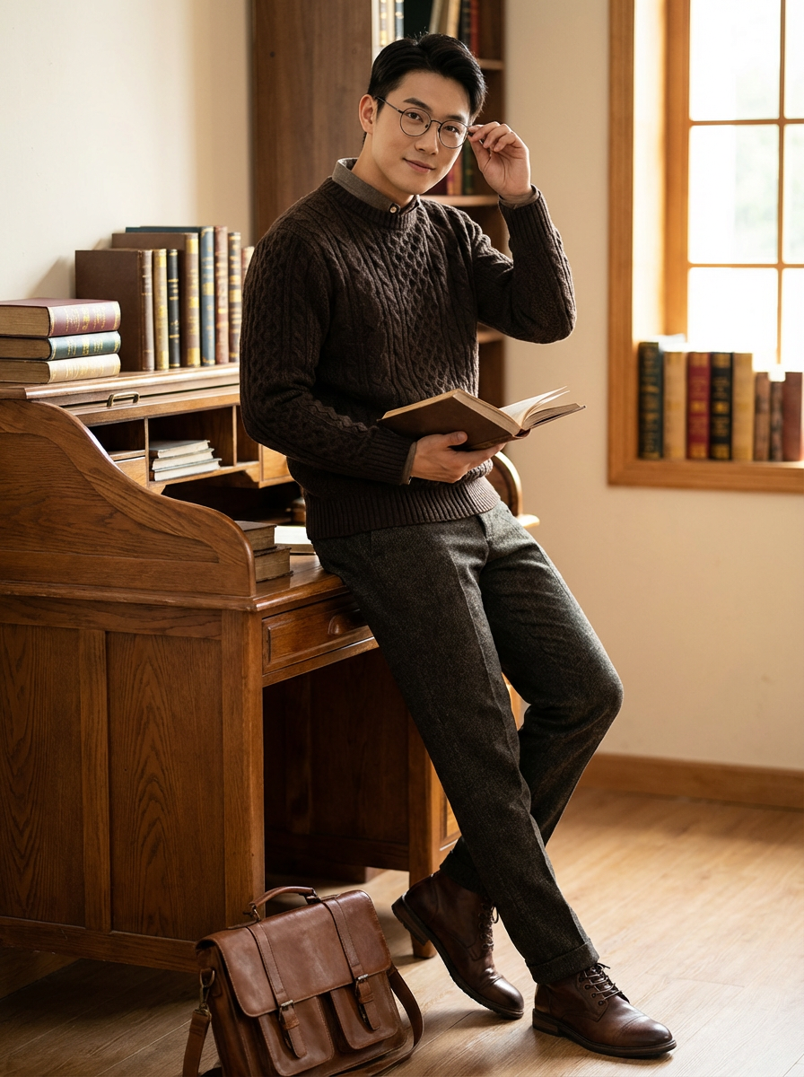 model in dark academia aesthetic, round glasses, cable knit sweater, stack of antique books, study desk scene