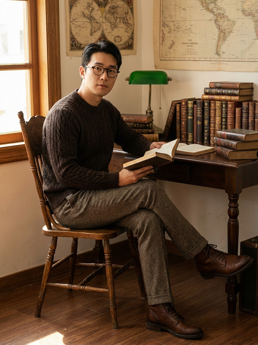 model in dark academia aesthetic, round glasses, cable knit sweater, stack of antique books, study desk scene
