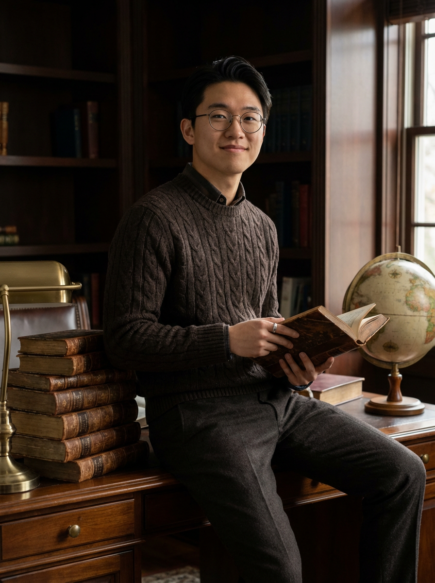model in dark academia aesthetic, round glasses, cable knit sweater, stack of antique books, study desk scene
