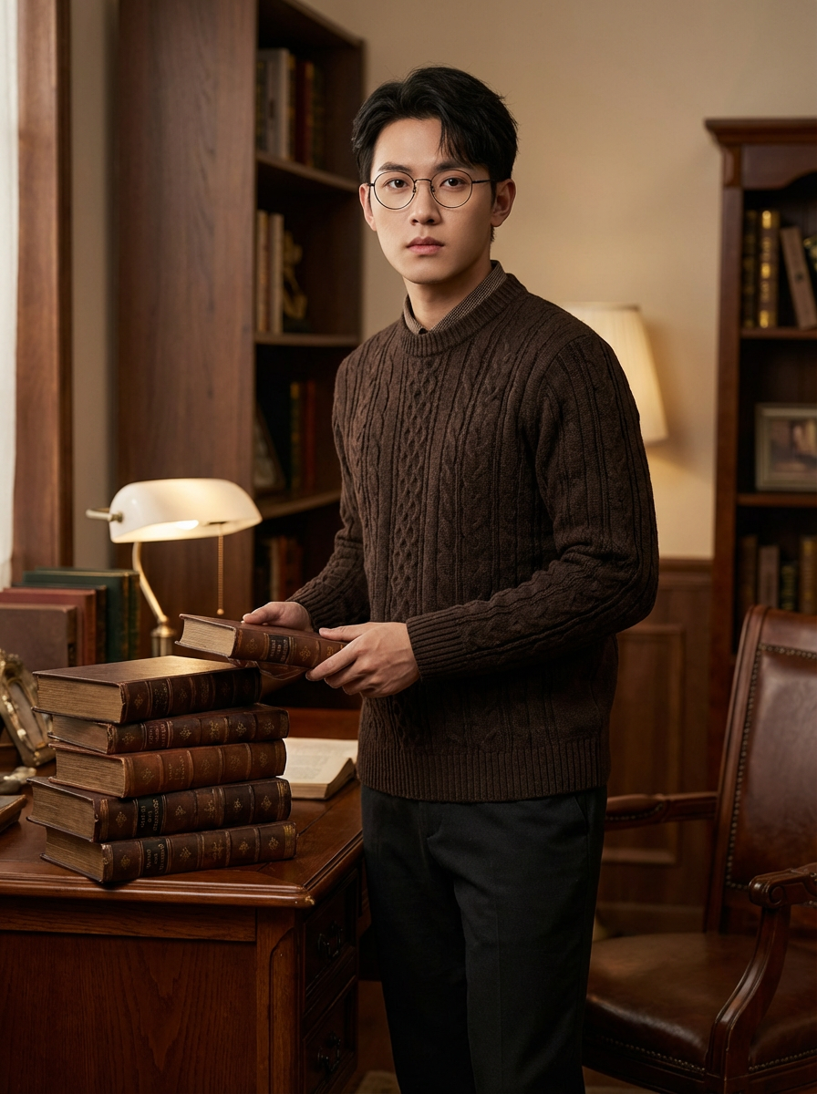 model in dark academia aesthetic, round glasses, cable knit sweater, stack of antique books, study desk scene