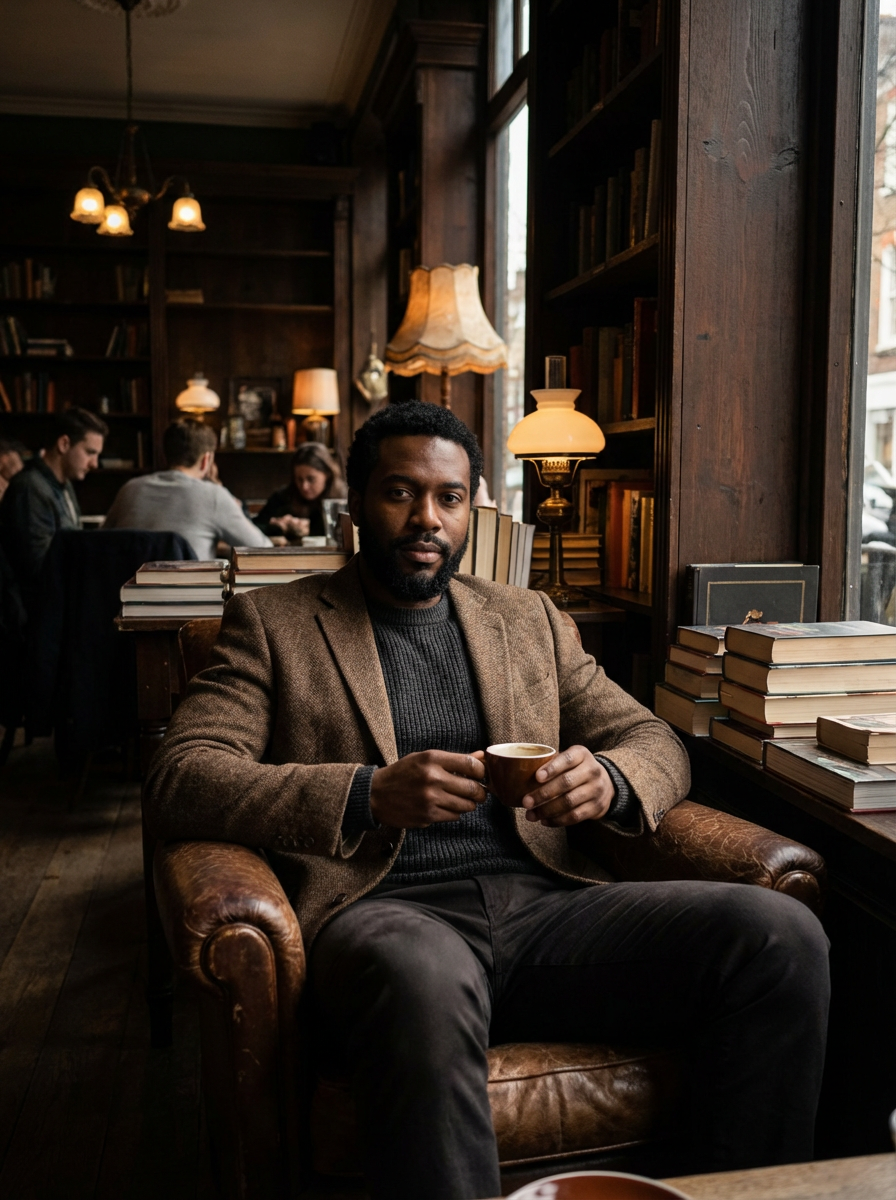 model in dark academia coffee shop, espresso and books, tweed and knits, warm moody interior