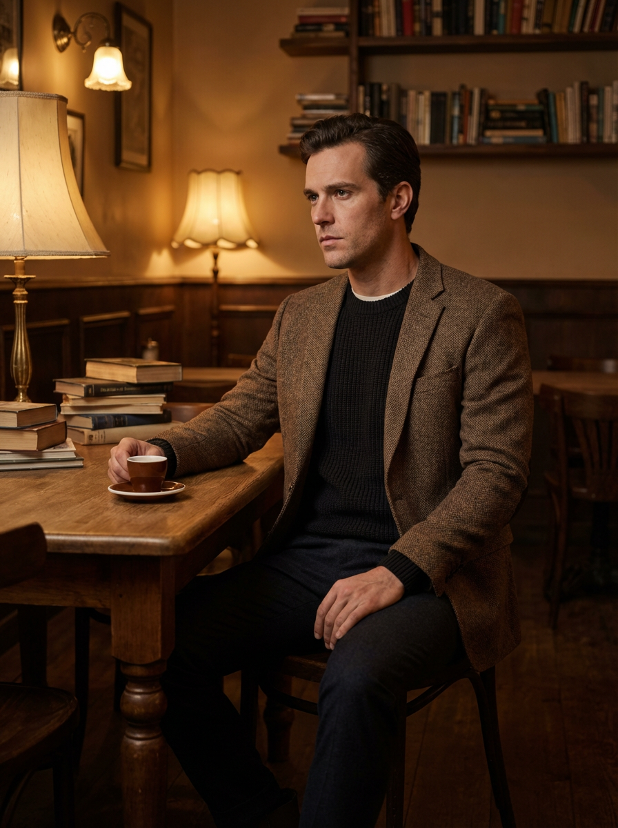 model in dark academia coffee shop, espresso and books, tweed and knits, warm moody interior