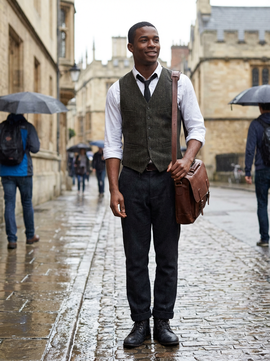 model in dark academia layers, vest over button-up, loose tie, carrying leather satchel, rainy day aesthetic