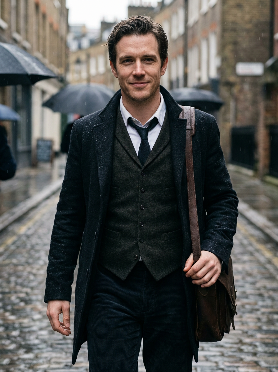 model in dark academia layers, vest over button-up, loose tie, carrying leather satchel, rainy day aesthetic