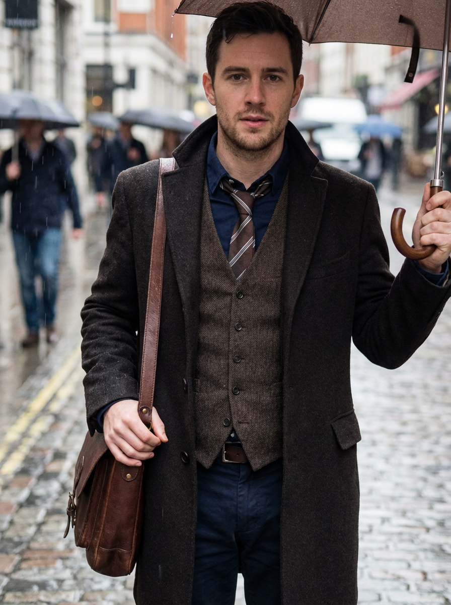 model in dark academia layers, vest over button-up, loose tie, carrying leather satchel, rainy day aesthetic