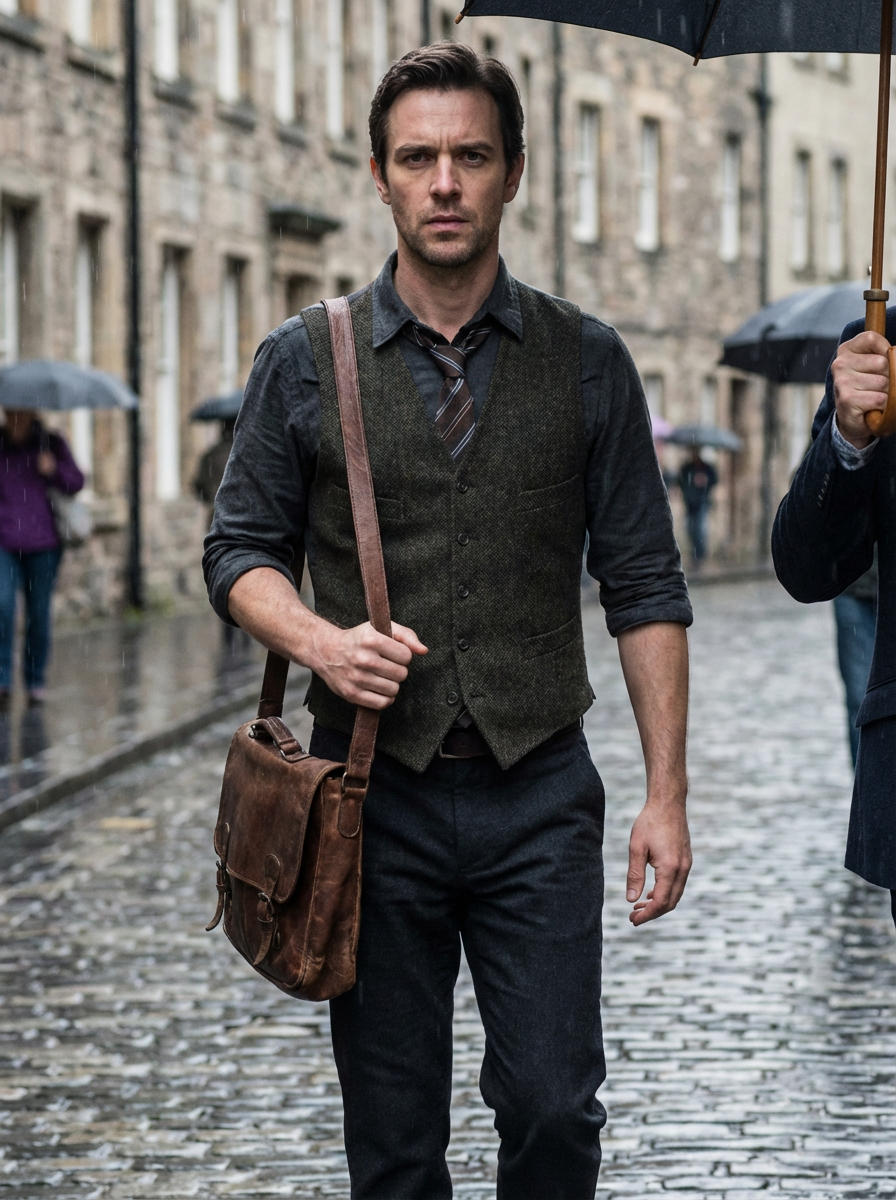 model in dark academia layers, vest over button-up, loose tie, carrying leather satchel, rainy day aesthetic