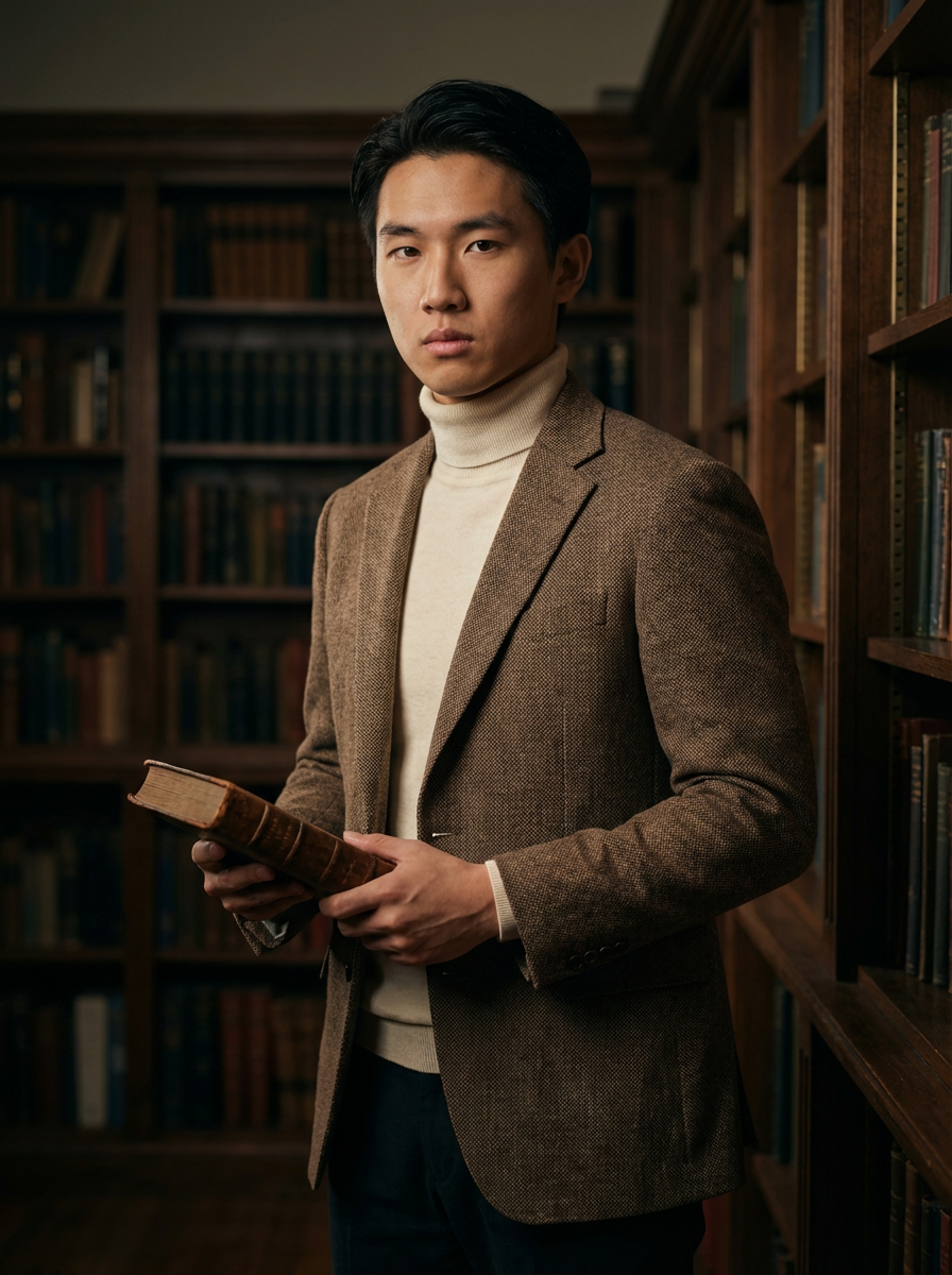 model in dark academia outfit, brown tweed blazer, cream turtleneck, vintage library background, moody lighting, holding old book